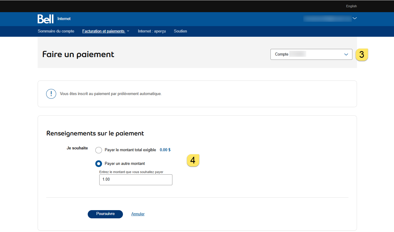 - Si vous avez plus d'un compte enregistré sur MonCompte, sélectionnez le compte pour lequel vous souhaitez effectuer un paiement dans le menu déroulant.